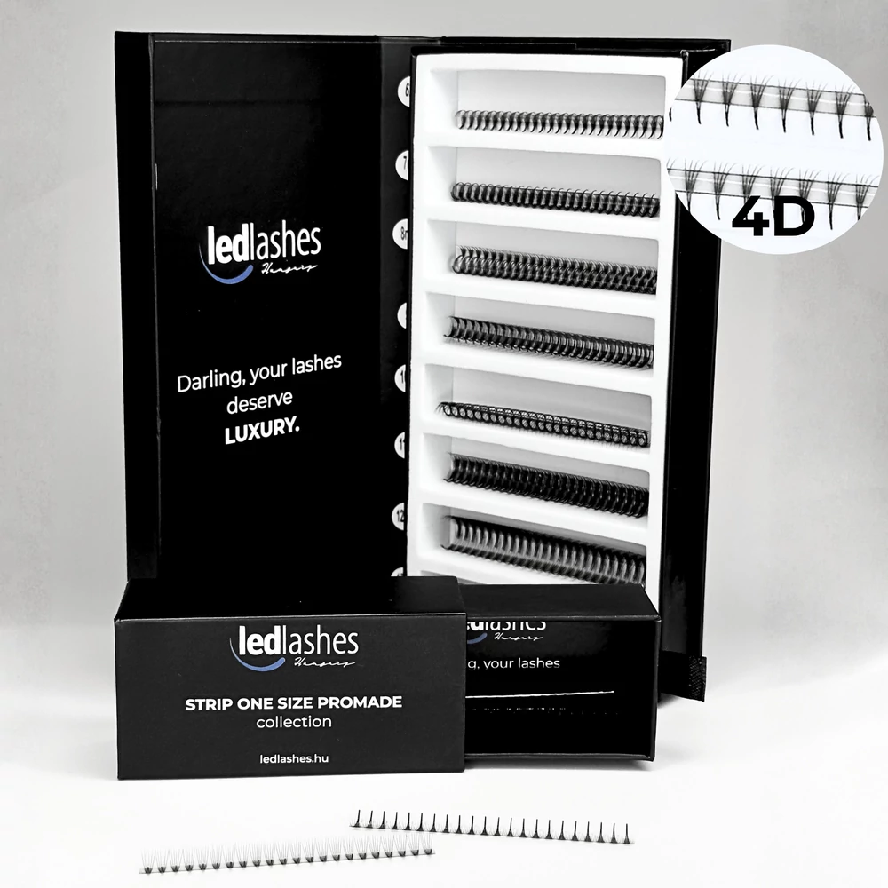 A LedLashes Strip Promade műszempillák a LedLashes prémium promade fanjait kínálják gazdaságos, 1000 fanos, ragasztócsíkra helyezett kiszerelésben.